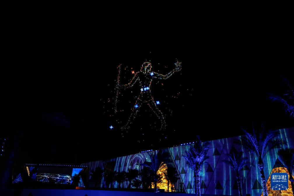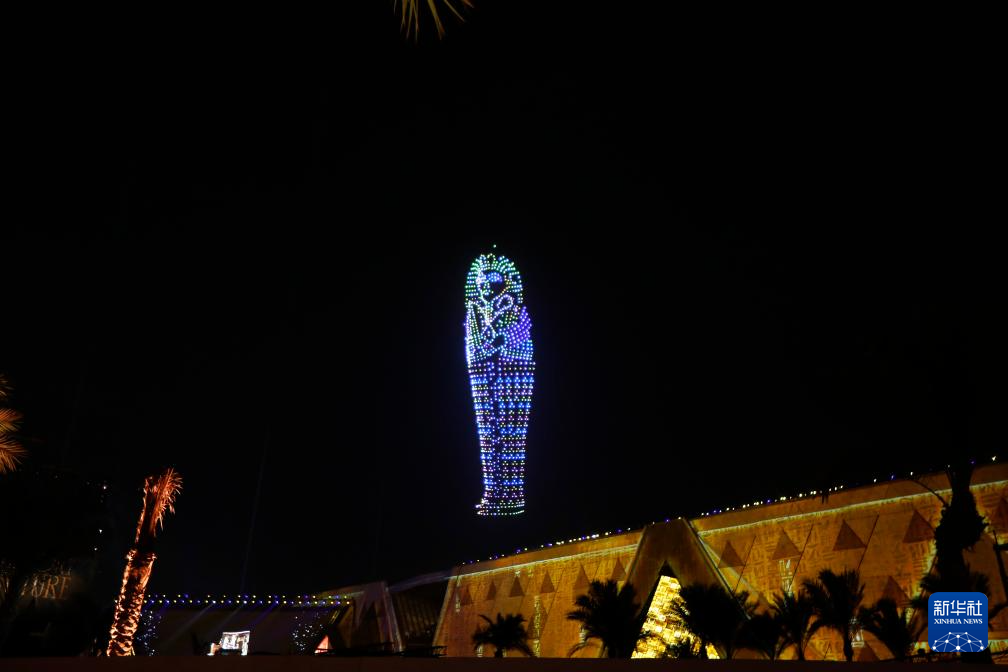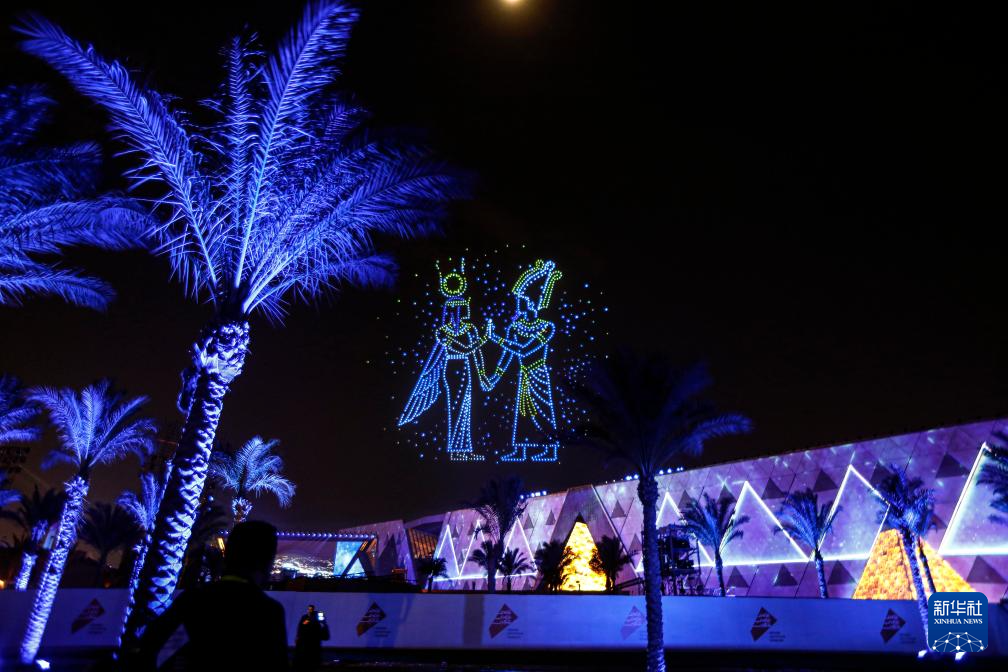 這是11月1日在埃及吉薩拍攝的開館儀式上的無人機表演和燈光秀。新華社發(艾哈邁德·戈馬 攝)