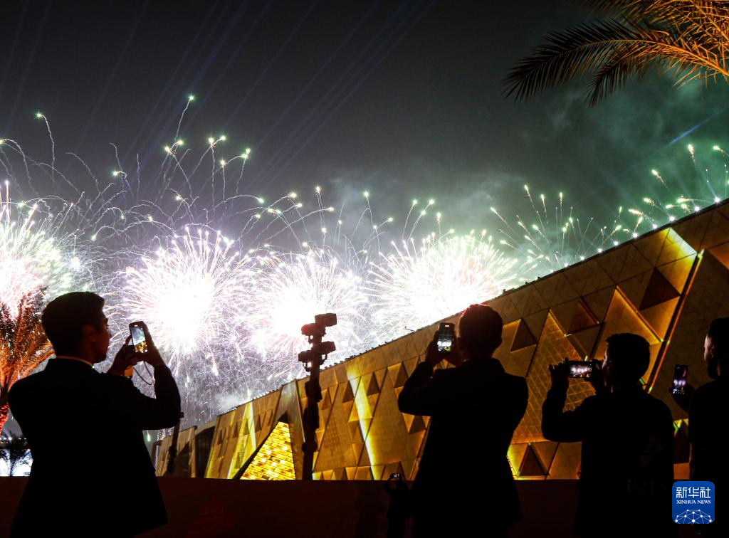 11月1日,人們在埃及吉薩舉行的開館儀式上拍攝煙花和燈光秀表演。新華社發(艾哈邁德·戈馬 攝)