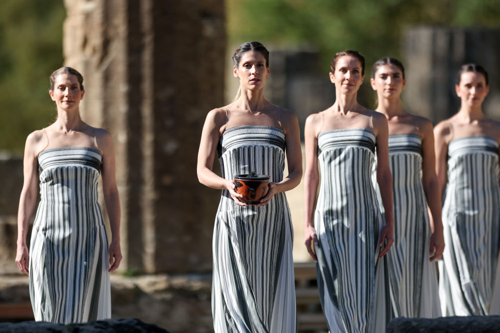11月24日,一名扮演女祭司的演員手捧火種罐入場。當日,2026年米蘭-科爾蒂納冬奧會圣火火種采集儀式在希臘伯羅奔尼撒半島的古奧林匹亞遺址舉行彩排。新華社記者 李京 攝